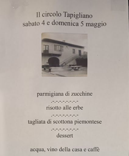 Read moreA Tapigliano, frazione di Nebbiuno, c’è un circolo, uno degli ultimi, dove si mangia ancora con 20/30 €. Ma le 5 Stelle non sono meritate per il prezzo, da solo ne meriterebbe 6. Ma per la cucina e l’atmosfera. Poca scelta di piatti, quasi sempre una scelta di pesce. Cucina curata, tradizione locale, e cucina mediterranea, servizio efficente. Lorenzo, lo Chef, si assicura con discrezione della soddisfazione dei clienti. La location è veramente quella dei vecchi circoli di paese, situati nel centro storico in case di pietra. Il deohr è il vecchio campo di bocce coperto. Ma non crediate che sia facile mangiare al Circolo di Tapigliano. Dovrete...