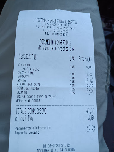Read moreSono spiacente di dover esprimere la mia profonda insoddisfazione riguardo al servizio presso il ristorante L'Impatto a Nerviano. Nonostante l’aspettativa di una piacevole serata in famiglia, l’esperienza è stata deludente.