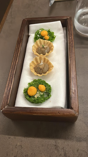 Locale arredato con gusto, molto particolare. Illuminazione giusta, come pure la distanza tra i tavoli. Personale accogliente e gentile. Il menù molto vario, prevede piatti particolari e mai banali. Vengono offerti degli stuzzichini di benvenuto molto particolari e ben presentati. Anche il pane aromatizzato (di propria produzione) al caffè da gustare con del burro è sfizioso. Abbiamo preso due antipasti, due primi e un secondo più dolci. Gli antipasti, due carpacci uno di fragolina e uno di gamberi delicati e saporiti, molto buoni. Discreti i paccheri cacio pepe gamberi e lime, ottimi invece gli spaghetti al riccio bdi mare e tartufo. Il polpo alla brace e carota fermentato stupendo. Anche i dolci molto buoni. Il prezzo non è basso ma è equilibrato per la qualità e particolarità dei piatti proposti dall ottimo chef. I piatto sono preparati al momento....