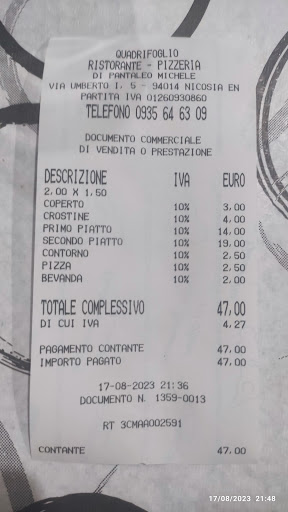 Read moreWe arrived at Quadrifoglio with a recommendation from someone we met a few towns over. He said it was amazing, and even this was an understatement. Everything was fresh, delicious, and serving sizes were ample. They don't have a menu because their ingredients/dishes change daily. We got pasta with seafood and a variety of appetizers. The service was amazing. We had...