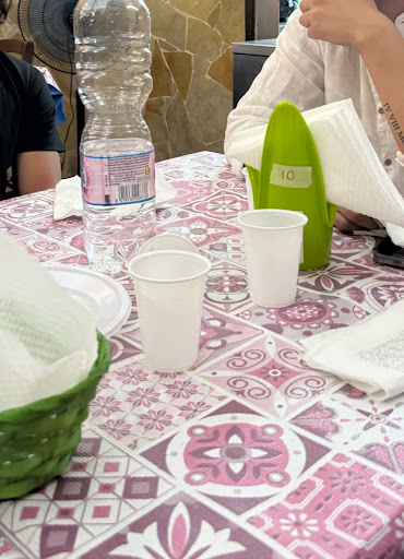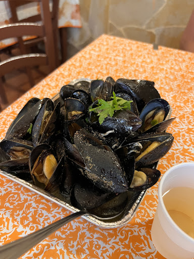 Abbiamo ordinato cozze gratinate (servite in una teglia usa e getta di alluminio), totani fritti (due porzioni minuscole a 28€ totali) e due primi piatti insipidi (linguine cozze e vongole che sapevano di pasta in bianco con l’olio e penne con il pesce spada che, sinceramente, sembrava appena uscito dal congelatore, altro che fresco), con condimenti anonimi e senza alcuna cura. Tutto servito con piatti e bicchieri di plastica. L’acqua era in bottiglie da supermercato (MD, per la cronaca). Durante la cena, le signore della cucina continuavano a guardarci, creando un’atmosfera sgradevole e poco rilassante.