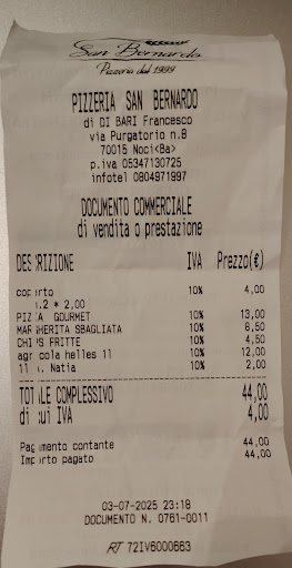 Read moreSituata nel centro storico di Noci, dove è sempre piacevole passeggiare, la pizzeria San Bernardo è stata una piacevole sorpresa. L'ambiente interno è piccolo, ma molto confortevole, arredato in maniera semplice ed in linea con l'architettura del borgo. Il personale è di un garbo e gentilezza ormai rari. Ho apprezzato molto il menù pizza, con un numero adeguato di scelta, senza i numeri esagerati di alcuni locali. Impasto leggero e ingredienti davvero buoni. Potrebbe essere ampliata l'offerta delle birre alla spina. Prezzi assolutamente in linea con la qualità dell'offerta, oserei dire anche al di sotto della media delle ormai troppe pizzerie che si spacciano per gourmet. In conclusione, ci tornerò...