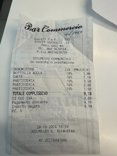 Read moreBar storico a noci in piazza Garibaldi a gestione famigliare i figli portano avanti questa attività nata nel più di sessanta anni fa,pochi spazi all'interno che in inverno è un po' un handicap,ma d'estate con i tavoli all' aperto è piacevole prendersi un aperitivo o un caffè, specialità i dolci ineguagliabili "le te@@e delle monache" quest' estate ho preso il gelato chiamato spumone ma non mi ha convinto molto,servizio cortese e veloce,prezzi...