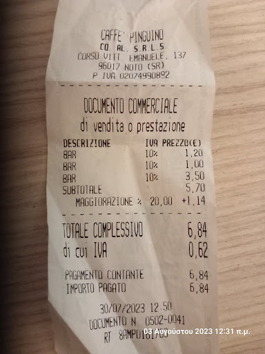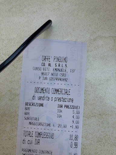 Read moreMi accomodo al tavolino con mia moglie per ordinare 2 granite ai fichi d’india, una con panna e una senza. Il bar si presenta bene, i tavolini si affacciano sulla via principale a circa 20 mt dal Duomo. Abbiamo aspettato un po’ senza essere considerati, una volta poi portate le granite ci viene presentato il conto chiedendo di pagare subito: nessun problema. Quando la cameriera vede la carta, dice subito che il bancomat è fuori uso. Fortunatamente provvisto di contanti pago 10,80 euro, pensando che è sì caro ma consideriamo che ci troviamo a Noto. Le granite sono comunque buone, non da urlo, girando la Sicilia ormai da due anni penso di averne mangiate a sufficienza per farmi un’idea e queste non rientrano tra le migliori. Comunque non ne ho mai mangiate di così care, nemmeno in un noto bar di Taormina. La panna utilizzata era spray o tipo Dolceneve della Cameo ( buona lo stesso ma me la faccio a casa mia) quindi non la classica panna da granita. Lo scontrino segna 5 eu granita con panna, 4 senza + maggiorazione del 20% pari a 1,80 euro. ? Sarà perché siamo a Noto, ok e Duomo a 20 Mt. Può essere. In due anni di tour siciliani è la prima volta che mi capita. Vicino a noi si accomodano 3 turisti che ordinano tre granite, di cui 1 con panna, per un totale di 12 €. I conti non tornano, strano, chiedo quindi delucidazioni al cameriere.Inizia l’arrampicata sui vetri: in un primo momento le granite dei nostri vicini di tavolo sono più piccole. La mia risposta è che i bicchieri sono esattamente uguali, non trovo differenze . Alla fine, non sapendo cosa rispondere, giustifica dicendo che quella alla frutta costano di meno mentre quelle che abbiamo preso noi, insieme a quella ai gelsi, costano di più. Ribadisco il cameriere è che la prima volta che mi capita di pagare a seconda del gusto scelto. Il cameriere se ne torna al bar borbottando.Quindi in sintesi: sovrapprezzo servizio +20%, sovrapprezzo gusto, e sovrapprezzo perché ci troviamo a Noto. Senza contare il risparmio della commissione perché manca il bancomat. Queste a mio parere sono solo prese in giro e trappole per turisti. purtroppo questa volta ci sono...