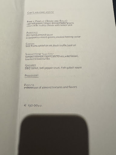 The Service is excellent. We got two recommendations by the Sommelier for Etna Bianco and Anne Nero dAvola. They’ve fulfilled our expectations. The Wine list contains many wines which are already sold out. This should be marked in the list to make it easier with your choice.The sparkling water comes from Nestle and I do not understand why a restaurant with such a demand doesn’t serve water from Sicily We took all the five course menu consisting of a burger, a dish of pasta with sardines, tuna and A fillet of seabass. All courses were delicious but in every course something could have been better. With the pasta I missedSome lemon, the tuna could have been medium cooked and the sea brass was cooked in the oven but not panfried. Yeah I missed the roast flavours. In general I missed the freshness and the flavours of herbs to make it better. I forgot the bread which...