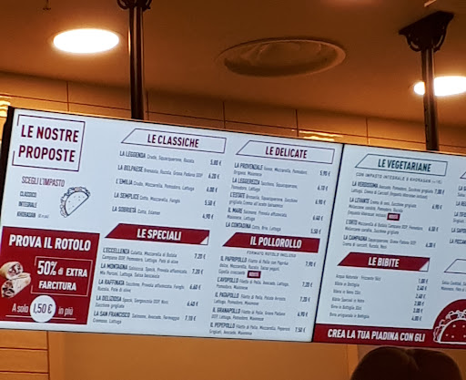 Read moreSono rimasto un po' deluso dalla piadineria, considerando la reputazione del marchio. Ho trovato una spina nel salmone della mia piadina San Francisco, un inconveniente spiacevole. Inoltre, la piadina a montagna, che avevo chiesto senza insalata, è arrivata con l'insalata. Spero che queste problematiche vengano risolte per migliorare l'esperienza...