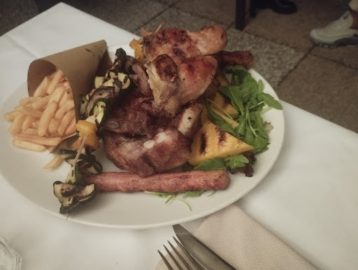 Read moreIl locale presenta un ambiente molto accogliente, carino e informale; ho solamente trovato un po' strano dover passare in mezzo ai tavolini che c'erano fuori per poter entrare all'interno, dove si può notare, infondo a sinistra, la brace dove viene cucinata la carne. Del resto, abbiamo trovato un cameriere molto gentile, cosa molto apprezzata: non in molti locali si ha la stessa accoglienza. Abbiamo ordinato una grigliata per due persone: c'erano un polletto, delle costine, delle salsicce, patatine fritte, spiedini con verdure grigliate e delle fettine di polenta e, finché aspettavamo abbiamo ordinato della porchetta. Devo dire che la carne è molto buona, compresi gli affettati. Lo consiglio vivamente a chi ama la carne e ne è appassionato. Ci torneremo di sicuro, per poter provare le altre...