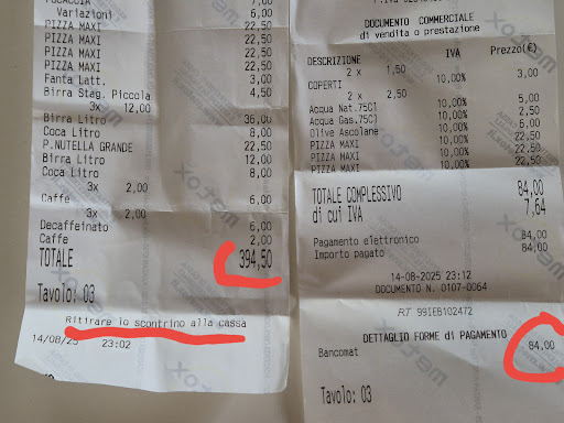 84€ di scontrino a fronte di un pagamento di 394,50€ L'unica realtà è questa. Lo scontrino che avete emesso (su mia insistenza) è stato solo quello relativo all'importo pagato con carta, la restante parte pagata in contanti non avete voluto registrarla nonostante vi sia stato richiesto ed a casa mia questo modo di evitare le tasse ha una definizione ben precisa. Quindi la vostra risposta non è veritiera e la vostra richiesta di rimuovere le foto dello scontrino mi pare una bella arrampicata sugli specchi per dissimulare una vostra mancanza tra l'altro perseguibile per legge.