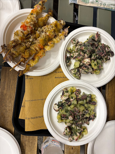 The typical local "hole the wall" where locals go! This is a place where they only cook daily catch. It's a mix of fried fish and they charge by weight (approx 400 grams/portion, plenty for one person). Get there 10-15 min early to get your number, they will call you inside the shop to make your order. Take away or eat at the few tables available in the front side walk. Friendly but with attitude ;). We spent 68 euros for a family of four and we left full bellies! The fish was amazing, very little batter to enjoy fully the flavor of each fish. Calamari, alici, tuna, spigole etc ... Highly recommend for a truly Italian experience and amazing food and wine. Also, the are very environmental conscious, all plates, silverware, trays are compostable or recyclable, they give...