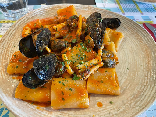Cold atmosfere. Both pasta dishes tasty but strangly half cold half warm when they should have been hot. My pasta was sliding off on one side of the plate because the waiter had my plate slanted i presume his thumb was in the sauce. The chips tasted as if they are fried in the same old oil as the calamari but the latter was good. Tiramisù was nothing as it should be, a throthy cream with non coffee tasting pavesini biscuits, a real let down for 4e each. On the up point my husband enjoyed his meal and its good to see an open kitchen , service was quite quick and the fish meals were good. We will be back to try again and hopefully i can up the stars. To be honest the place was full so its not easy to keep everyone happy. 2° recensione 25/04/25 tried again must admit what we ordered was tasty but the paccheri were raw , not al dente but proper raw. Had to cut each piece in 4 to be able to eat them. The staff were better today , the portions smaller than last time. Would definatley have upped the stars if the pasta was proper cooked but pratically leaving 30e of pasta (2 people) is a no no, the calamari and chips...