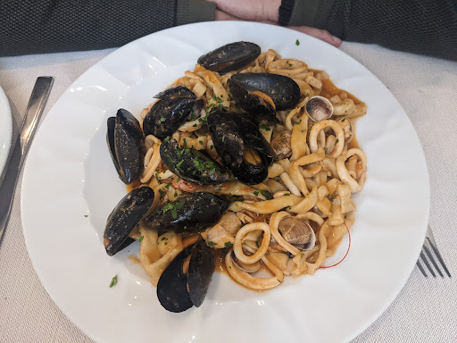 Domenica 6 ottobre pranzo su prenotazione,location accogliente con tanta bella gente,in due io e la mia signora,a prendere l'ordine è venuto Franco sempre gentile,allora 2 Paccheri con pesce spada chiesta se possibile con altro tipo di pasta,ci ha accontentati con della pasta fresca fatta in casa risultata Eccellente,Shoute di Cozze e Vongole Strepitose e Squisite,vino acqua e per finire in bellezza 2 Babà alla crema,2 caffè e liquore di meloncino,è stato tutto perfetto, abbondate e Ottimo,un grazie alla signora Rosy e al resto di tutto lo staff,Alberto👍😋🌹😋👍Angela N.b: i bagni al piano -1 sempre...
