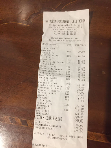 Mi sono recato alla Trattoria Fossatone per una cena di coppia, la qualità del cibo è stata nella media (d’altronde le rane, che abbiamo mangiato, qui sono la specialità). Purtroppo un episodio mi ha portato a scrivere questa spiacevole recensione: ordinato l’antica sto caldo di pesce, il sautè di cozze e vongole arriva con un moscone che galleggia nel sugo; faccio notare l’accaduto al personale di sala che prontamente me lo fa rifare. Premesso che nel piatto “nuovo” c’erano cozze calde e cozze un po’ più fredde (saranno state mescolate quelle vecchie con le nuove? Mah), nel conto non c’è stata traccia di “scuse” da parte della gestione. Non si pretende di consumare piatti senza pagarli, ma il buon senso porterebbe qualsiasi titolare a omaggiare, se non l’antipasto di per sè non esattamente economico, almeno i dessert (due umili sorbetti per la “modica” cifra di 4€ cadauno). A parte questo spiacevole episodio che sicuramente mi porterà a non prenotare più in questo ristorante - nè tantomeno a consigliarlo - va specificato che la Trattoria Fossatone è tutt’altro che economica, con un conto di 80€ per 2 antipasti, 2 secondi, 2 sorbetti e mezzo vino della casa (tra l’altro fatto erroneamente pagare 50 centesimi in più rispetto a quanto...