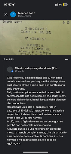 Read moreIn riferimento al commento SORPRESA ALLA CASSA: non mi sorprendo di vedere che la vostra risposta è sempre la stessa “leggiti quel libretto strano che è il menù”. Ma mi chiedo allora, è la gente che è scema o c’è qualcosa che non torna nell’esperienza presso il vostro ristorante? Son sicuro che la risposta sarà in linea ancora una volta con il vostro atteggiamento. Abbiamo chiesto un piatto per il Bambino (4 anni) e quello che scrivi, gentile signora alla casa che non ha preso l’ordine, non corrisponde alla verità. Non capisco cosa c’entri il fatto che mio figlio sia un buongustaio. Lasciate fuori ogni commento su di lui per favore. Forse ha finito il piatto perché era effettivamente una porzione baby? Aspettando l’ennesima conferma della vostra maleducazione, mi consolo pensando che con questo cibo, atteggiamento, prezzi, fra un anno dovrete cercarvi tutti un altro lavoro. E mi dispiace per i bravi ragazzi che ci lavorano.