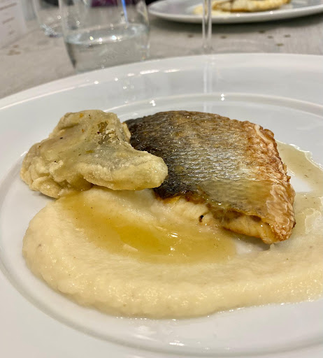 Main Course: The roasted sea bass fillet was cooked perfectly—moist and flaky. The celery root purée and tempura artichoke on the side were just as delicious.