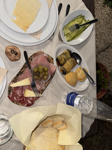 We came here on the last night of our honeymoon. They only offer a tasting menu at 50€ pp (price might change). They brought the first course out extremely fast, including the bread basket. I find it odd that in Sardinia they charge you for a bottle of water but often don’t open it for you or pour the first glasses - it would be a nice touch at an upper end restaurant like this one. The first course was these mini meat-stuffed seadas (my least fave, because there was an odd taste, maybe of horseradish?), eggplant and zucchini that were all super good, alongside a cheese and charcuterie platter. Then Lima beans, a very creamy melted cheese and wild boar pieces. The cheese and boar together were delicious! We then had gnocchi in a tomato sauce with small meatballs which was delicious and the famous Zuppa Gallura, which had good flavour but I’m not crazy about the soft bread - tastes a bit like very overcooked lasagna noodles. By this point we were honestly full but we were served the typical Sardinian suckling roast pig. It was good, but I personally can’t really enjoy eating baby pig. For dessert we were offered a choice of lemon sorbet or seada (fried pastry with melted cheese inside and honey drizzled on top). They only brought us 1 of 2 but it ended up being fine because we were beyond stuffed! I wish the waiters would rush a bit less in the beginning and explain more what’s in each dish. The lights on the patio outside are also extremely bright white. This is common in Sardinia I’ve noticed, including in hotel rooms. Overall really nice experience absolutely...