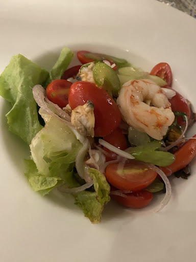 seafood salad contained a couple of prawns, couple of mussels, no cuttlefish (as listed) and some lettuce and a couple of tomatoes.