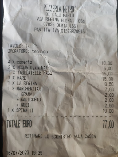 For those “smartypants” who complain about unasked “tips”: “coperto” on a restaurant bill refers to a cover charge or table charge, which is a per-person fee covering the cost of things like bread, silverware, plates, glasses, and tablecloths. It's a standard practice (almost everywhere) in many Italian restaurants and is not a tip. The coperto is usually a small amount, typically between €1 to €3 per person, and is listed on the menu. Educated first yourself and after post useless comments or complaints which have no relevance after all....