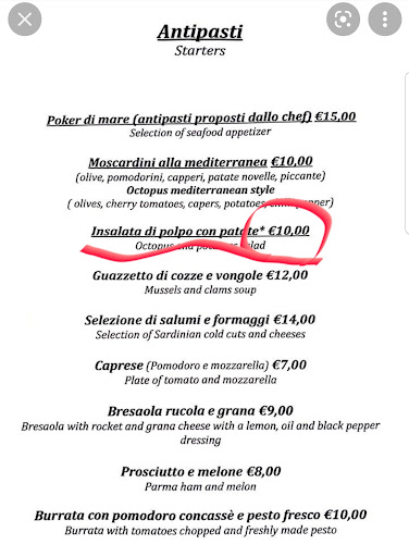 Be careful at this place because you can get very surprised when getting the bill. First ,,Insalata di polpo" priced 10e in menu is actually 12e. Second thing is, when I wanted to order the ,,Linguine allo di scolpio con pomodorini" from menu which costs 14e (at least according to menu), the waiter recommended me to go with the same option but with lobster. I agreed. The one thing he forgot to mention that the other option which is not on the menu is 2 times more expensive (25e). On the bill it is called ,,Spaghetti aragostelle" which is of course different type of pasta than what I had. So I tought we got wrong bill (wrong price of starter, wrong name of dish, 2 times higher price). I told him that there is probably some error on the bill. But he explained that it is exactly what we had and asked if it is ok. I dont speak Italian, you dont speak English (not to mention other waiter who runs away when he hears english), so no, bill is not ok but what should I do call the police? Just get your prices and menu together and be transparent to your guests because now you look like complete...