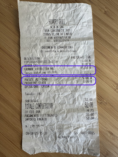 Al momento del conto, il prezzo mi è sembrato un po’ alto rispetto a quanto consumato, quindi ho chiesto lo scontrino. Con mia sorpresa, ho visto che era stata addebitata una cotoletta senza patatine (al prezzo pieno) più patatine fritte e patate al forno come voci separate, quindi pagando due contorni.