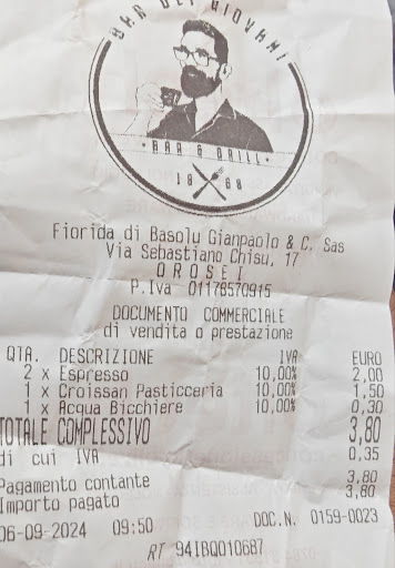 Oggi dopo qualche giorno, ho rifatto colazione qua. Posso dire che da Orosoei a Budoni non ho trovato un bar che si possa definire tale, ottime brioches di pasticceria(non tre marie come il 99% dei bar della zona) barista (barba rossa) veloce gentile e competente. Servizio rapido prezzi super onesti. Ci tenevo ha fare questa recensione come monito agli altri bar (parecchi) che ho visitato in questi 10 giorni, caffe imbevibili, prezzi non in linea, la maggior parte dei bar sono vetusti con le luci spente, come per non mostrare la fatiscenza, io sono ligure e pertanto nell'accoglienza non siamo il massimo, ma qua, chi ci è stato, confermerà, non sono da meno anzi, ma in questo bar si respirava un aria diversa, non cambiate! La professionalità paga sempre, a volte ci vuole più tempo e sacrificio, ma paga e se ritornerò non mancherò di...