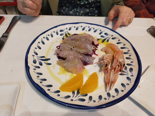 Read moreLa "Trattoria San Domenico" è un piccolo e stretto locale, posto in una posizione strategica (proprio davanti al castello Aragonese e con la possibilità di fare una piacevole passeggiata lungo il lungomare dopo i pasti) e permeato da un atmosfera di storia e tradizione mescolate a modernità che rende il ristorante un posto affascinante; possiede una veranda davanti l' entrata per i giorni d'estate e soleggiati. L' arredamento è, come scritto poco sopra, un accostamento moderno ed elegante a un contesto storico anche se, non nascondo che i vari oggetti sparsi nel locale sono messi un po' disordinatamente; impossibile non notare Il grande armadio con la selezione di vini e alcolici messi contro il muro nel salone principale. La ragazza che ci ha assistito era molto servizievole e attenta alle comande, Good👌! Prima di iniziare a parlare del cibo, vorrei fare una premessa: a quanto pare al ristorante non servono frittura mista di calamari e gamberi, un vero peccato.... Comunque, la freschezza del pesce e l' alta qualità delle portate si sente: abbiamo iniziato con una selezione di antipasti di mare composto da un tris di antipasti caldi con polpo scottato, appetitosi, soprattutto i gamberetti al sugo con spinaci.... Le linguine con scampi è certamente il piatto che mi è piaciuto di più: era bello caldo e oliato con un buonissimo sapore di sale misto a pasta, che me le sono divorate con gusto, consigliate! L' arrosto misto che abbiamo preso per secondo, invece, non ci ha soddisfatto un granché; il pesce era sì fresco e buono ma le porzioni servite erano troppo esigue : una sogliola, due rane pescatrici, una porzione di scampi, un pezzetto di calamaro e peperoni e spinaci. Abbiamo terminato la cena con un piattino di deliziosi dolci caserecci di Ortona (non servono dolci fatti sul momento: Tiramisù, panna cotta, cheesecake, ecc.) e un buon caffè. In generale, il ristorante è bello e con cibo a km/0 ma, in alcuni punti, per quanto riguarda la scelta delle portate, ci ha lasciati un po'...