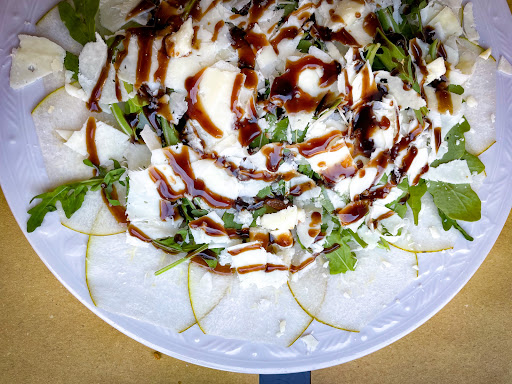 But a unique antipasti also caught our eye - Pear Carpaccio! Thinly sliced pears formed a base for arugula, pecorino, walnuts, drizzled with a sublime balsamic reduction. This dish blew our minds. This small plate is a symphony of flavours and textures: sweet, crisp pears, tart and sweet balsamic, sharp pecorino and rich, earthy walnut umami for days, and the fresh, peppery arugula dazzled our tastebuds and lit up all our food brain’s pleasure nodes! This dish alone is worth the visit.