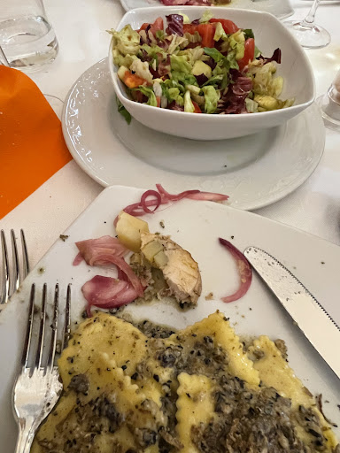 A Hidden Gem in Orvieto – Absolutely Phenomenal We had dinner at Trattoria del Moro Aronne in Orvieto, and it was one of the most memorable meals of our trip. Important tip: Make reservations. This is a small, cozy restaurant, and we watched them turn away multiple walk-ins throughout the evening. The Wine: Don't overlook the house red – it's excellent and the perfect complement to their dishes. And limoncello at the end of the meal was fantastic! What We Ordered: Eggplant Parmesan (appetizer) – Quite possibly the best I've ever had. Perfectly executed. Bird's Nest Vegetarian Lasagne with Pecorino and Honey – This was Creamy, subtly sweet, and so light it practically melted in my mouth. The combination of savory pecorino with a touch of honey was absolutely divine and surprisingly refreshing. Tagliatelle with Wild Boar Sauce – Pure, rich deliciousness. No tomato in this sauce – just deep, concentrated flavor that lets the wild boar shine through. Steak with Gorgonzola and Chocolate – My husband's choice, and he loved it. Who would have thought it paired so well! It was delicious! Dessert: We ordered both the tiramisu and the "chocolate cake." Get the chocolate cake. It's not actually a cake – it's a warm, molten chocolate mound surrounded by cream. Heavenly. The atmosphere is intimate and cozy, and the service was wonderful. This place delivers an exceptional dining experience without any pretension....