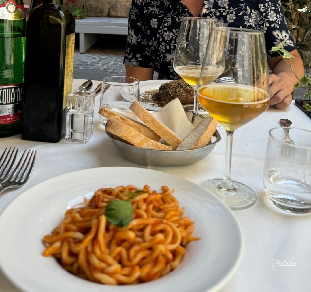 Truffles are great but we all know that if used wrong they overpower anything. Well, I'm glad to say that they know how to use truffles the right way. My wife started with the handmade umbrichelli pasta with freshly shaved black truffles and I had the spaghetti dell'ascaro carbonara, which were both great. Then I ordered the filetto alla cardinale and my wife got the filetto al tartufo (truffles). I've always frowned on putting anything on a good steak but hands down they were 2 of the best steaks I've ever had. Yes, I get to eat half of what ever my wife orders. Good for me and especially when dining at Trattoria la Palomba in Orvieto.