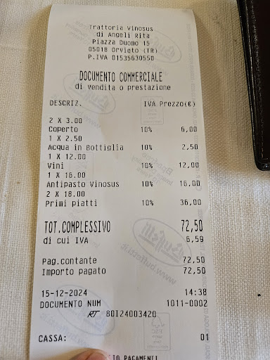 It is not just a "trattoria" as meant in Italian, it is a lot more! They offer you a small menu, but of excellent selected and of high quality products. They offer a selection of traditional dishes like "carbonara" or "amatriciana", however, what surprised me what the rest of the menu, very particular dishes, it's like a fusion of tradition and modern cuisine! Fantastic selection of local and Italian wine, we had a very good Orvieto wine, light and incredibly matching with our fish plates. The place is very small, but cozy, only 5/6 tables inside and maybe 10 more outside, in the terrace. The view faces a side of the Duomo and part of some private house gardens, not special, anyway nice. Staff was attentive and very kind. Service super efficient. Maybe not very cheap, but for what we ate and for the quality the cost...