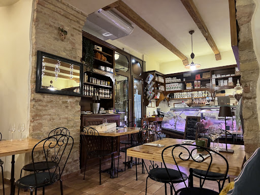 Read moreIl locale è essenzialmente un negozio ma ha diversi tavoli nella piazzetta adiacente. Siamo stati qui in una sera di agosto e abbiamo apprezzato la quiete di fondo, mossa da un piacevole sottofondo jazz fornito dal locale (non dal vivo) e la brezza che rinfrescava l'aria. Siamo rimasti convinti dalla presentazione che ci hanno fatto della crescia marchigiana (una focaccia morbida e calda con ripieno di rape cotte e saltate, se ho inteso bene) e dell'orologio di salumi e affettati, con un calice di rosso Conero. Abbiamo trovato il vino discreto nel gusto e nella struttura, e non aggressivo, molto buono. L'orologio poi è un assortimento di parecchi tipi di salumi locali, dal più delicato (ore x:00) al più deciso (ore x:30) e di formaggi locali, questi ultimi in senso antiorario, con secondi rappresentati da un pecorino con un "salame" ai fichi (il dessert) e per lancetta una fetta di ottimo melone. Salumi e formaggi sono stati una piacevole scoperta, non avevo idea della varietà marchigiana, e sia gli uni che gli altri un crescendo di gusto. Prezzo adeguato per la qualità e quantità offerta, che non lascia con la fame, anzi. Esperienza che ci ha assolutamente soddisfatto e...