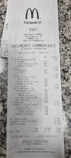 Read moreSono stata domenica pomeriggio, davvero pienissimo, abbiamo aspettato tanto, ma veramente per prendere due caffè un succo, una spremuta e due torte, tantissime persone in attesa. Devo dire però che anche l’attesa è stata molto piacevole perché la signorina Cristina mentre faceva caffè e cappuccini nonostante l’evidente difficoltà e le persone in attesa alcune anche poco educate è riuscita con le sue parole e il suo atteggiamento a farci star bene, coninvilgendo anche Adama, che la seguiva e stava al gioco e alle sue parole. Attesa lunga ma tutti i clienti si allontanavano con il sorriso, ci ha fatto sentire importanti e al primo posto nonostante la tanta gente e le tante persone, alla fin fine anche l’attesa è stata molto piacevole, questo è quello che si dice mettere il cliente al primo posto, tutte le persone in attesa erano comunque rincuorate dal fatto che si stavano occupando di noi e non so come riuscivano a capire chi era meglio servire prima e chi invece aveva ancora un po’ di pazienza. Avevano poco personale, sicuramente sarebbe servita qualche altra persona ad aiutarli, l’altra ragazza con la maglietta bianca e i capelli corti invece era maleducata e svogliata è più interessata a guardare il cellulare che i clienti. Consiglio veramente, prodotti ottimi come non mi sarei aspettata da un Mc Donald e il farci sentire capiti e al primo posto non ha fatto altro che migliorare la nostra prima esperienza e anche quella di tutti quelli che come noi erano lì in attesa e con cui parlavamo. Torneremo sicuramente sperando di trovare ancora loro due per fargli i nostri complimenti (siamo stati talmente entusiasti che stamattina ne stavamo ancora...