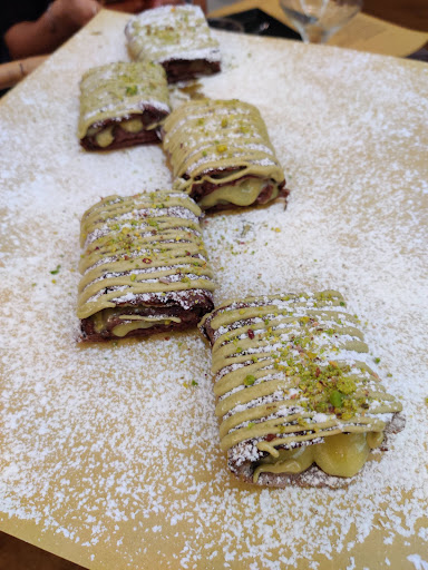 I went to this restaurant with my family a couple of days ago. Despite its location is not the prettiest areas (as the restaurant is located around factories) I really liked the interiors. We got immediately welcomed and taken to our table. The peculiarity of this place is their wide choice of "pizza alla pala", which means that the pizza comes on a board and it's basically rectangular. Another interesting fact is their wide choice of vegan pizzas which come with various veggie meat alternatives and coconut mozzarella. I picked a regular pizza with buffalo mozzarella and another with chili pepper and garlic oil. The pizzas are quite thin, however, they seem to fill you up very well while leaving a pretty light sensation. The taste and the ingredients are great that's why I decided to opt for their rolled pizza with pistache cream, it was delicious. I would recommend this place to anyone who has would like to try a new interesting place that offers vegan & gluten free...