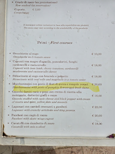Ci siamo stati in una tipica serata d'estate e la location prometteva davvero bene, in centro sulla piazzetta insieme ad altri ristoranti luce sul tavolo tovagliolato di stoffa (coperto 3€ p.p.)..ordiniamo due antipasti, 2 primi, un contorno, una bottiglia di vino (20€ troppo un bianco di un'etichetta conosciuta e diffusa)...dopo qualche minuto dal personale ci viene comunicato che gli antipasti scelti non erano più disponibili poiché essendo tutto fresco non hanno grosse quantità...no problems! Ripieghiamo su tre primi e un contorno...il servizio seppur puntuale e attento non ha placato l'attesa se consideriamo che uno dei primi piatti era per una bambina e che forse avrebbe dovuto avere tempi più brevi (Piccoli accorgimenti). Arriva il primo piatto con crema di fiori di zucca e vongole veraci (presenti in un numero di 4-5 e non veraci ma giganti)...con un condimento davvero eccessivo e non 'tirato' il sughetto che rispetto alla quantità di pasta (buona porzione)era completamente sbilanciato... passiamo agli altri due arrivati dopo almeno 5 minuti... entrambi avevano orecchiette come tipologia di pasta ma uno al pomodoro(10€) e altro con cime di rapa (fuori menù 17€). Quantità di pasta giusta in entrambi i casi ma quella al pomodoro 'navigava' letteralmente nel sugo, che era buono ma si presentava davvero 'annegata' oltremodo... passiamo al terzo, orecchiette con le cime di rapa con alici (non pervenute se pensiamo alla spinta che avrebbero dovuto dare al piatto!) e mollica di pane soffritta...buono ma era un'orecchietta con verdura di stagione ripassata in padella...la qualità delle materie prime si percepisce ma andrebbe rivista innanzitutto la proporzione tra condimenti e paste e soprattutto con maggiore attenzione ai dettagli in una location di tutto rispetto! ..il contorno ovviamente è arrivato prima dei primi, patate al forno buone senza anche qui cura nei dettagli, presentate con la buccia e a spicchi ma in un piattino con foglio di carta assorbente come se fossero fritte🤔. Dato il luogo meraviglioso andrebbero curati di più i dettagli per offrire alla clientela variegata dei piatti tipici, buonissimi e ben bilanciati! Conto compreso di 2 caffè 83€...da rivalutare...forse una serata troppo...
