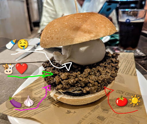 Amazing food! The habanero balls are pleasingly spicy/hot 🌶️🔥 The fries are very well done, crispy and not overly oily 🍟 But daaamn, the burgers are too sure for 🤤 I had the one (in the picture) with minced & spiced beef, smoked garlicky eggplants, sun-dried tomatoes and a whole burrata 🤯 Sooo creamy 🤤🤍