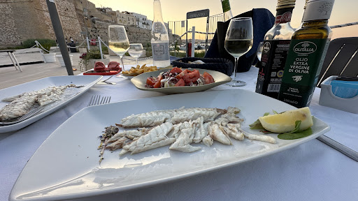 Locale con bella vista sul porticciolo e i bastioni di otranto. Arriviamo qui solo ed esclusivamente per la scritta "pizzeria" in bella vista tra l'altro, appena arrivati ci viene detto che non era disponibile ormai da un anno e quindi sdegno iniziale... ci mettono a sedere con poco garbo e eleganza ovviamente con la mascherina sotto al collo. Ordiniamo per antipasto le polpette di polpo arrivate un pò bruciacchiate ma tutto sommato buone. Arrivano i primi e i secondi insieme come avevamo deciso, spaghetti vongole e bottarga arrivati senza la bottarga, orecchiette al pomodoro fin troppo semplici, insalata di mare buona e seppia pure. Patatine fritte che non accennavano ad arrivare, chieste due volte e dopo 20min sono comparse. Servizio lentissimo (per la serata piena spero), entrati alle 19:30 usciti alle 21, fin troppo per quella poca roba citata sopra. Flotte di clienti come avvoltoi sulla spalliera che aspettavano di sedersi a un tavolo, altri invece che se ne appropiavano ancora da sparecchiare senza nemmeno chiedere al personale. Roba da urlo. Disorganizzazione completa in sala. Speso il giusto per quello che si è mangiato, non proprio da...