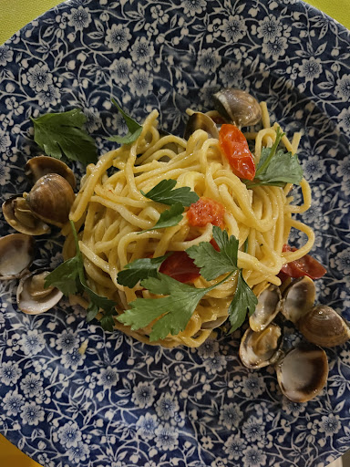 Read moreAll'arrivo un uomo ci comunica di essere da solo e che, pertanto, poteva prepararci solamente un menù da 18€ a persona (esclusi acqua e coperto). Menù di pesce consistente in: una pasta all'uovo con vongole e pomodorini (pomodorini mancanti in una porzione, vongole con sabbia, sapore mediocre); gamberoni e verdure grigliate (nelle foto 5 gamberoni, nei piatti serviti 3 gamberoni e in uno dei piatti, 2 gamberoni; gamberoni insapore e dall'aspetto rivoltante; verdure messe casualmente nel piatto, in un piatto mancavano melanzane e peperoni, presenti negli altri piatti; il menù decantava verdure grigliate, sono stati serviti melanzane e peperoni grigliati, con melanzane sott'olio e insalata mista in busta); compreso nel menù anche un calice di vino, eventualmente sostituibile con coca cola senza variazione di prezzo. Sapori assolutamente mediocri, a tratti cattivi o insapore. Al conto sono stati aggiunti 7€ di coperto, per 3 persone, e 2€ per una bottiglia d'acqua naturale. Disponibilità di dessert/liquori, ovviamente fuori menù, quindi aggiunti al conto: limoncello, sorbetto e tiramisù confezionato. Alla richiesta di un caffè ci si sente rispondere: "sono da solo, non ce la faccio, il caffè lo prendete al centro storico." All'entrata si legge chiaramente di pasta fatta in casa, evidentemente non fresca, dato che non c'era neanche il tempo di preparare un caffè. Rapporto qualità-prezzo:...