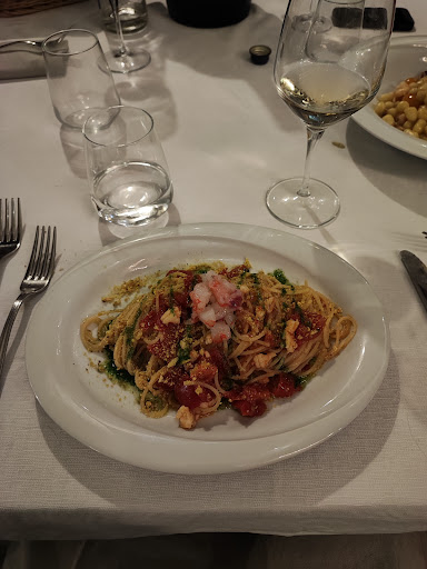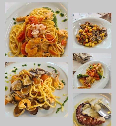Dania były smaczne – lekkie, świeże, ładnie podane. Szczególnie dobrze wspominamy owoce morza – kalmary w delikatnym bulionie z nutą ziół i pomidorów. Do tego dobre białe wino i woda gazowana – wszystko zgodnie z włoskim rytuałem.