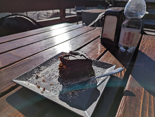 Read moreVicino c'è una grande piazza con un ampio parcheggio. Il dehor fuori è molto accogliente soprattutto durante le giornate di sole, se fa freddo è godibile al sole si sta molto bene. Ciò che sicuramente colpisce di questo locale almeno per quanto ci riguarda, è l'alta qualità dei dolci ma anche della miscela di caffè. Abbiamo mangiato una torta Sacher ed uno strudel entrambi davvero molto molto buoni. Unica nota dolente se vogliamo, il genera di musica, trap vari, anche un po' alta, che abbiamo chiesto di abbassare. Tolto questo, anche il servizio buono, tutti molto gentili e disponibili. Presso onesto, due fette abbondanti di torta di alta qualità , due tazze grosse di caffè americano allungato con l'acqua, una bottiglietta d'acqua, circa €13....