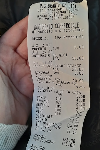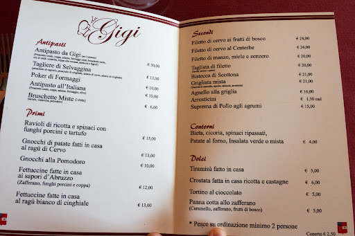 Read moreLocale pulito e ben posizionato, con vista panoramica. All'ingresso chiedono l'esibizione del green pass e la cosa ci fa enorme piacere. Pranziamo con una pizza margherita buona, una pappardella ai funghi e coppa discreta e un filetto di cervo ai frutti di bosco a gusto soggettivo niente di che e troppo cotto rispetto alla richiesta di media cottura tendente al sangue. Come contorno si chiedeva una patata al forno, ma non è disponibile, una bietola ripassata, ma non è disponibile alla fine la cicoria c'è. Vino della cosa buono. Chiediamo, solo se non c'è da aspettare molto, 6 arrosticini. Dopo una attesa che mi sembravano 20 minuti abbondanti (locale pressoché vuoto) chiedo se gli arrosticini fossero pronti e molto professionalmente la cameriera mi risponde che l'attesa era dovuta al fatto che la griglia fosse stata spenta e si è dovuta riaccendere e poi che l'attesa fosse di soli 13 minuti e non 20. Se durante il servizio mi fossi permesso di dare una risposta del genere a un cliente mi sarei ritrovato il giorno dopo senza lavoro. Comunque, se siete di strada e avete bisogno di un pranzo onesto potete anche fermarvi da Gigi, ma consiglio il menù turistico da 10...