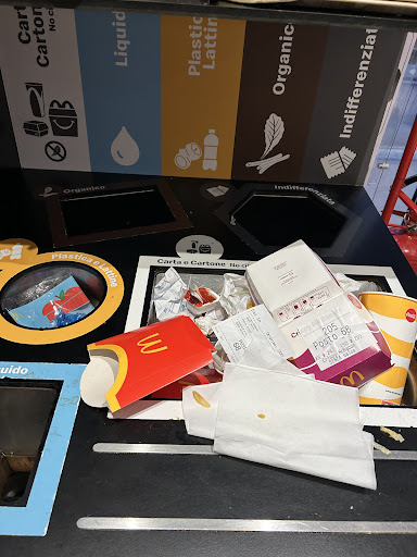 Ci sono tornato martedì 18 marzo verso le 18: locale praticamente vuoto, numeri rimasti nei tavoli dopo l’ordine, cestini colmi e la mia spazzatura giustamente l’ho accumulata sopra. Le foto dell’esterno dicono il resto. Dall’inizio alla fine del tempo di permanenza, dei dipendenti non se ne è mosso uno per pulire. Eppure vi assicuro non sembravano trafelati, e chi finì il turno alle 18, rimase lì in compagnia a chiacchierare dopo lavoro, non accorgendosi di nulla. Peccato perché bel film di McDonald di Netflix, si vantano della qualità e il titolare raccoglieva la spazzatura...