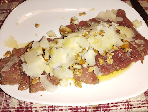 Passato per pranzo, ho trovato/scoperto proprio il tipo di locale sullo stile che a mi piace: una trattoria/osteria senza troppi fronzoli, in stile rustico che cucina locale. Il menù prevede una intera pagina alla specialità del locale ovvero la tagliata di manzo (scottona), che poi viene ripresa anche nel menù tradizionale negli antipasti sotto forma di tartare in 4 varianti. Io ho scelto, di queste ultime, quella con olio al tartufo, pere, grana, pepe, davvero buonissima. I cappellacci con le erbette anche molto buoni,forse un filo troppo burro ha riempito il fondo del piatto, patate al forno sublimi, verdure sott'olio OK! Il personale è molto cortese,i tempi in sala sono pressoché perfetti (occhio a non dimenticare le forchettte tra un cambio e l'altro). Buono anche il cabernet della casa. Vi consiglio sicuramente questa osteria, Voto finale 4 su 5. La 5 stella non l'ho data perche: parcheggio piccolino, leggero odore sgradevole nel locale interno, qualche filo di troppo da nascondere. Un saluto 🍀