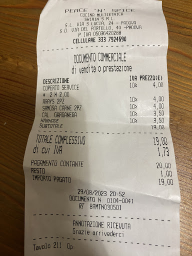 Read moreSono stata in questo locale per un aperitivo. Abbiamo ordinato due porzioni di arays (da 2 pezzi) e due porzioni di samosa di carne (da 2 pezzi), un calice di vino e un drink analcolico. I tempi per ricevere le ciotoline sono stati biblici, tant’è che avevamo già quasi ultimato le bevande. Al loro arrivo ci sono state portate solamente due ciotoline, una per tipo (anziché due per tipo, come da ordinazione). Pensando di esserci spiegati male noi, e non avendo più voglia di aspettare, non abbiamo fatto presente la cosa. Una volta arrivati in cassa però, ci è stato prospettato un conto spropositato di € 27,00. Sembratoci eccessivo, abbiamo chiesto spiegazioni, constatando che l’ordine delle quattro ciotoline (due delle quali mai arrivate) ci era stato addebitato per intero. Una volta fatto presente l’errore, le due porzioni non consumate ci sono state stornate, con un po’ di perplessità e reticenza generale da parte della ragazza alla cassa. Ciò nonostante, € 4,00 di coperto, nel conto, per due minuscole ciotoline, mi sembra eccessivo, tanto più che non compare nel menù, dove oltretutto il coperto previsto, se consumata in loco la cena (con piatti e posate) sarebbe di €1,50. Poca chiarezza,...
