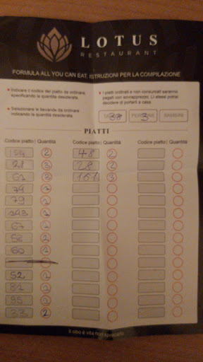 Lotus, non va bene. Location molto bella con ampio parcheggio e facilmente raggiungibile. Siamo arrivati alle 12:30, ci hanno fatto accomodare e ci hanno portato il foglietto dove devi segnare le portate, il menù si guarda scannerizzando il codice QR sul tavolo oppure domandando il menù cartaceo. Dopo cinque minuti ordiniamo da bere e lasciamo il foglio con su scritto i numeri dei piatti ad uno dei camerieri e già qui c'è qualcosa che non va, agli altri tavoli vicini a noi dopo dieci minuti di attesa avevano già portato da bere e poco dopo le portate, a noi ancora nulla. Dopo svariate chiamate ai camerieri ancora nulla, passa mezz'ora e finalmente portano da bere e da mangiare. Finite le prime portate ci prestiamo a segnare altri piatti sul foglietto e lo consegnamo sempre ad uno dei ragazzi. Da qui comincia il disastro. Vediamo che dalla cucina i piatti continuano ad uscire ed anche i nostri vicini di tavolo avendo ordinato dopo di noi il cibo gli arriva quasi subito, a noi invece no. Passati 35 minuti chiamo uno dei camerieri, il ragazzo con gli occhiali, ed avvisiamo che i nostri piatti non stavano arrivando e che era passata più di mezz'ora, lui guarda il foglietto e si accorge che i piatti non erano stati segnalati alla cucina, bisognava aspettare ancora. Dopo dieci minuti arriva anche la seconda portata. Mi aspettavo di più dal cibo, il riso era cotto poco e risultava leggermente duro e la qualità del pesce era mediocre. La terza portata non siamo riusciti a mangiarla perchè passata un'altra mezz'ora dall'ordinazione ci siamo stancati e ci siamo alzati per andare via. É impensabile aspettare 30/40 minuti da una portata all'altra, penso sia una delle poche volte che mi sia alzato da un ristorante senza aver finito di pranzare. Quando siamo andati alla cassa per pagare abbiamo segnalato i problemi di organizzazione alla titolare e ci ha fatto pagare solo un pasto con bibite e coperto, senza però domandarci scusa per l'accaduto. Non credo di tornare...