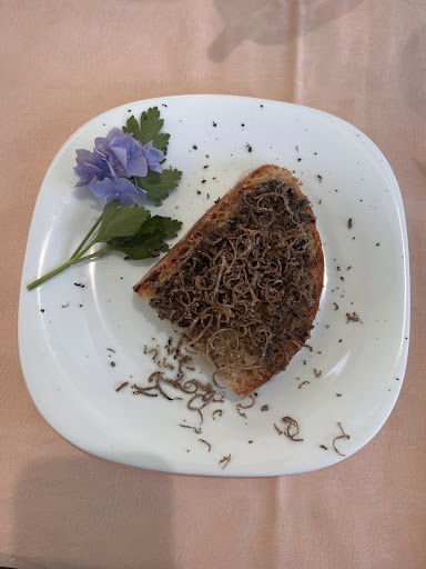 Das absolute Highlight: die Trüffelgerichte! • Die frisch zubereiteten Tagliolini mit Trüffeln waren al dente und in einer cremigen Sauce serviert, die perfekt mit dem erdigen Aroma der frisch darüber gehobelten Trüffel harmonierte. • Die hausgemachten Ravioli in Trüffelsauce überzeugten durch ihre Füllung und den intensiven Geschmack – ein Traum für alle Trüffelliebhaber. • Und als Vorspeise: Trüffel-Crostini, einfach, rustikal und voller Geschmack, begleitet von einer liebevollen Dekoration aus Kräutern und Blüten – ein echter Augenschmaus!