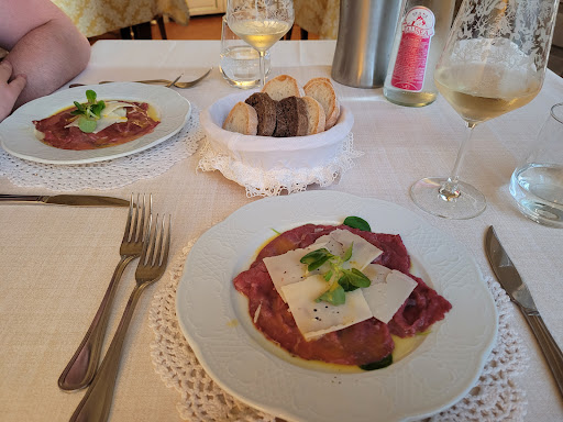 We are staying neer by at Borgo di Coleoli resort and we were looking for a good local restaurant, quick look in Google maps reviews I spotted this one The place itself looks like a royal restorant with amaizing wall paintings and the huge chandelier, very Italian palace atmosphere. We asked for tomatoes bruscheta (out of the menu) for starters (they were excellent) with the bread soaked just enough with olive oil and garlic We ordered 4 diferent pasta, bolognes, carbonara, tomatoes souse and carbonara e tartufo which was special for that evening, we also ordered the Firentina steak (700 gr) All the dishes with no exception was amaizing, the pasta carbonara was delicious and the special with tartufo was even better We had a very good house white wine The service was also great, plates replaced with every course You would have expect that the prices would be for royal as well but we were very surprised to find dinner to be much less than expected and very well worth the level of the food we had