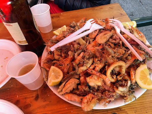 The food was honestly only ok. The lady will fill a tray with random stuff, way too much than you'll actually eat and you need to ask her to remove stuff. Take like €10 worth of stuff off what she proposes (it's done by weight). Octopus is extra beyond this pile of sea creatures. The starters are served cold, which wasn't very nice for me personally. The fish is simply deep fried and is fresh thankfully but quite bland beyond that. The baby squid was not prepared correctly, with bone and ink not removed which was not great. The sardines were nice, shrimp was nice, anchovies were bitter.. just a very mixed bag. The atmosphere is not great either, bad music and fluorescent lights. Fine overall but just go to a market to eat fried fish/octopus/squid whatever you like during the day and go somewhere a bit nicer for dinner. That's my...