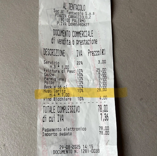 When the bill came, they charged €7 for the Hugo Spritz. I pointed out that they had said €5, but they insisted only Aperol Spritz is that price. Honestly, there’s no real difference between the two besides the color, so it felt misleading. They refused to honor what was said, which left a really bad impression.