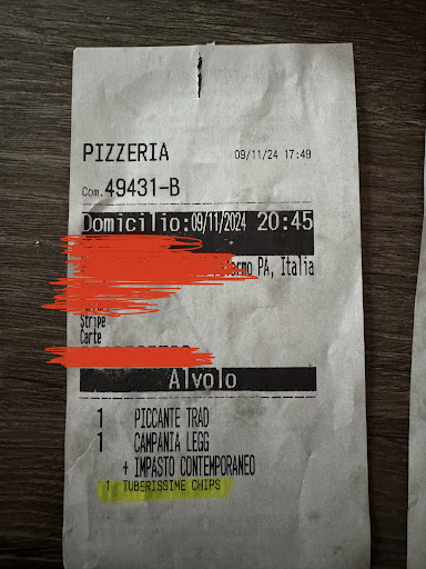 La seconda donna, da lei indicata, giunta dall’ esterno del punto asporto-delivery, presumo quindi dal lato ristorante, è stata assente fino al momento della consegna della pizza, ore 21:40, alla quale è stato solo riferito “grazie eh”, per poi allontanarci prima che si freddasse l ordine.