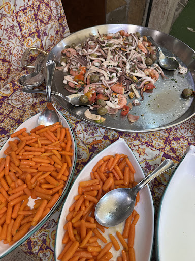 Hey guys!! I gotta tell you about this little place in the heart of Palermo’s street food district - the Bollaro Market. We walked alllllll thru this market on recommendation of our sassy awesome tour guide Max yesterday; all of them attempting to tantilize first our sense of sight with their beautiful plates of seafood and fresh verduras (veggies) e frutti (fruits). Some also had their vendors out in force to entice us in with words like honey, But THIS little place not only drew us by sight and sound (Ms Patricia’s bold tones brought in the crowds!) but for some reason their dishes stood out among the rest! All of the staff seemed to work as a finely tuned machine! They all made us feel welcomed comfy - like we walked into nonnas kitchen for lunch! We at first just wanted to grab some Basa fried fish to go but they said NO NO! Come sit! What else would you like? Messina con Sal! (A local beer with salt - my husband says the salt completely changes the taste experience!) They bring over a quant little table covering that LOOKS like cloth and makes you feel like you are sitting in the cutest outdoor trattoria among friends and family! We were lucky enough to be seated at a front table to the passersby; enjoying the sights and sounds of music and completely enveloped by the atmosphere that surrounded us! We were brought a wonderful sesame encrusted bread while we waited for our food to arrive, and Patricia checked on us frequently - even though she was not our actual server. We got the feeling this was either a family run establishment or that the the people here had been working together so long they worked like family as everything seemed to run so smoothly and everyone seemed to operate with a sort of family intuition! I loved to just watch each one move about and Interact with the customers. Then our food arrived! We had ordered the tomato salad, which were beautifully ripened and sliced heirloom tomatoes over a bed of field greens, my husband loves this salad - he just adds some olio and vinegar, some salt and fresh black pepper and it’s a PERFECT light and refreshing summer salad. The tomatoes were perfectly plump n juicy and a BEAUTIFUL deep red! I had the Basa fish fritte which is dusted with the lightest and finest cornmeal I’ve seen and fried simply with salt to perfection. A little lemon on top is all you need. It’s light, the bite is meaty yet soft with not a single bit of fishy taste to it. Perfetta! And as our side we had the potato fritters w polenta chips. Again. Fried perfectly and the fritters were wonderfully flavored with garlic and maybe some kind of cheese inside? They were fantastic!! Crisp outside n beautifully soft n flavorful inside. I could literally eat these all day, but knew I would be no good w all those carbs lol To pay is very efficient as well all you need to do is take your number up to the register and they have your order ticket ready - you get taken care of quickly! We had a wonderful time and know where to go should we find ourselves back in Palermo looking for some yummy street...