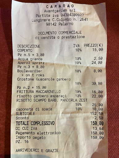 Read moreINCOMMENTABILE (in negativo, purtroppo). Veramente non saprei da dove iniziare per descrivere la serata oscena appena trascorsa. Avevamo un’amica che arrivava dall’Inghilterra e abbiamo scelto questa location per il panorama ed è stata L’UNICA COSA bella di questo posto, poi un susseguirsi di indecenze culinarie e nel dettaglio: ANTIPASTI presentati come piatti gourmet e che sono un’accozzaglia di ingredienti messi lì senza senso e senza gusto; CAPONATA DI PESCE SPADA senza nessun pezzo di pesce spada ma un insieme di sedano e carote con una salsa asprissima; CROSTONE presentato con guacamole e che è una fetta di pancarrè tagliata a triangolo, con sopra una crema di avocado (di pessima qualità fra l’altro) e insipida; PRIMI PIATTI un risotto scottissimo, privo di sapore, nonostante il menu parlasse di asparagi, gambero crudo, guanciale. Abbiamo praticamente lasciato i piatti quasi integri senza che nessuno ci chiedesse le motivazioni e quando abbiamo chiesto il conto si sono limitati solo a dire se potevano portare via i piatti. Chiediamo il conto e per 4 cocktails (con zero patatine o salatini vari), 2 antipasti, 2 primi il conto viene 150,00€ con 15€ di servizio (3€ a persona!).
